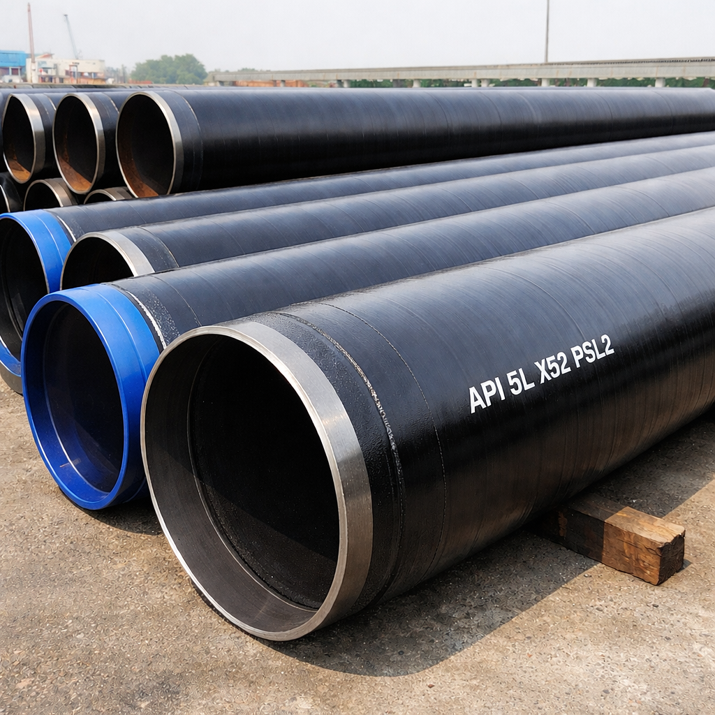 Grade: API 5L GR. X52 PSL2 (LSAW) · Size: 16” diameter x 0.375” wall thickness · Design Pressure: 60 bar · Beveled Ends: As per ANSI B16.25 · Dimensions: As per ASME B36.10M · External Coating: Minimum 3mm extruded polyethylene, medium density (S type), in accordance with DIN Standard 30670 · Pipe Length: Limited range, 11.8m – 12m · End Protection: Protective end rings or caps · Marking: As per API Standard 1.Chemical composition 2.Mechanical properties: hardness, tensile, impact test as per standard requirements 3.NDT:NDT according to material standard